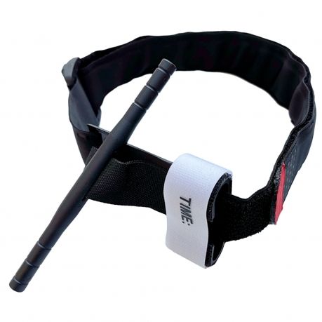 протяните ремень через трехщелевку туго затянув турникет на конечности. Оставшуюся длину ремня оберните вокруг конечности;