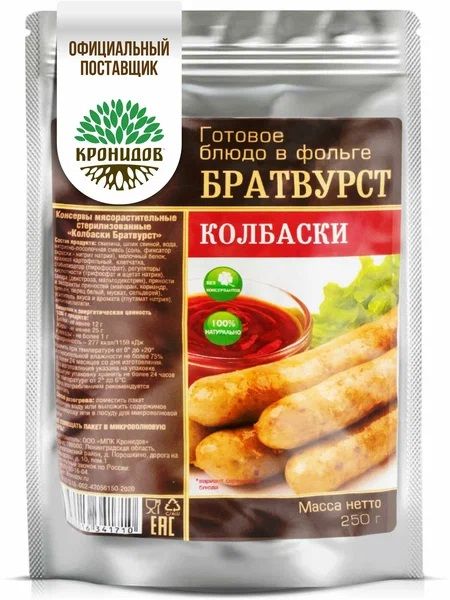 Читать все статьиГотовое блюдо «Колбаски Братвурст» 250гр. (Кронидов)