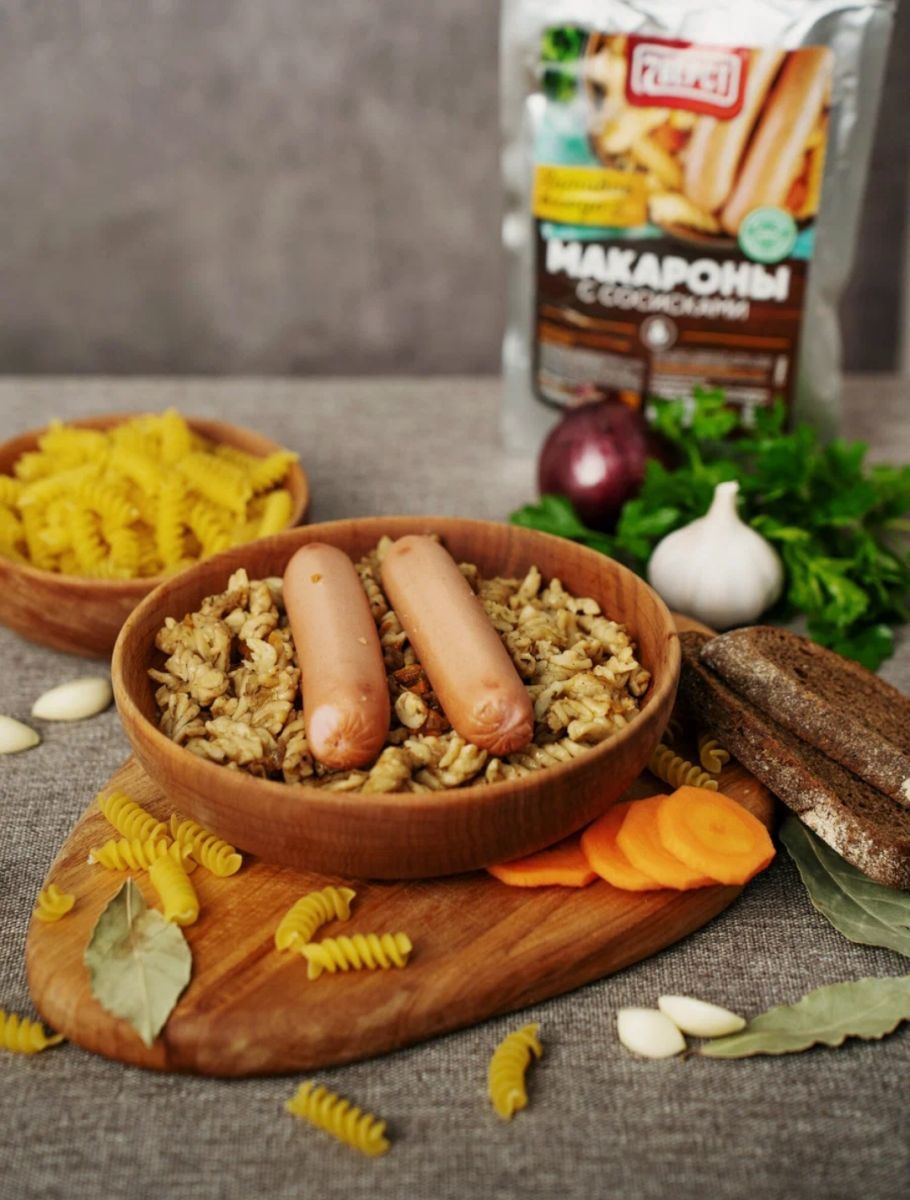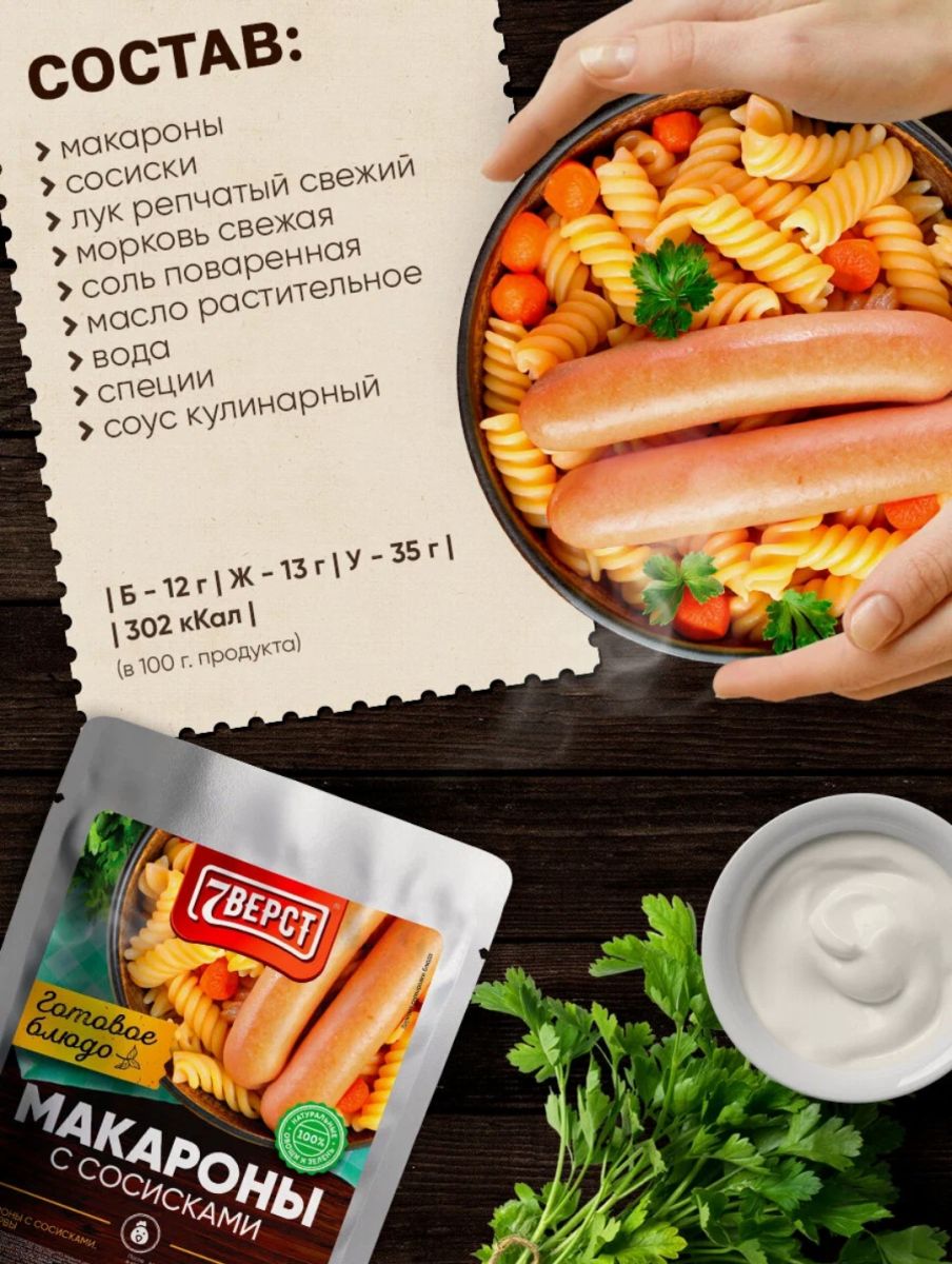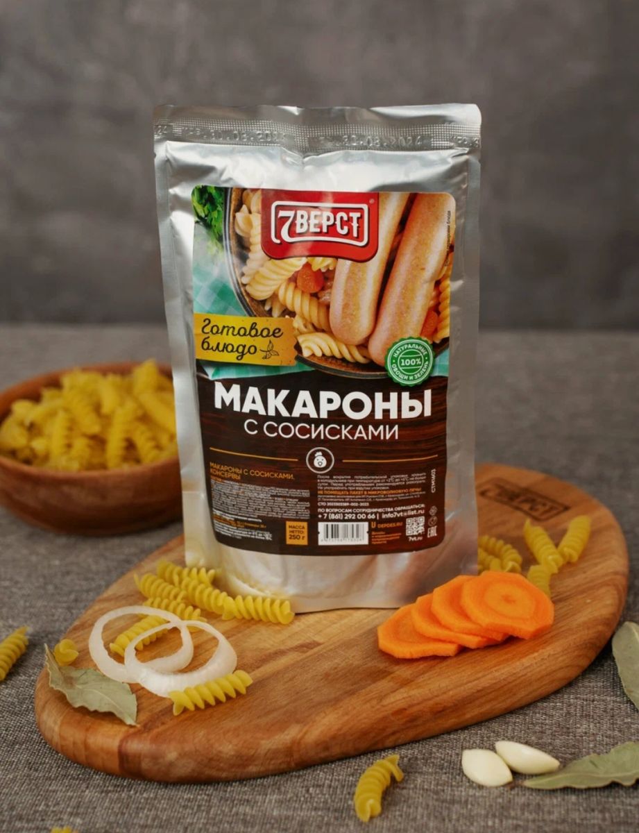 "Макароны с сосисками" - это простое, но очень вкусное блюдо, которое любят и взрослые, и дети. Аппетитные сосиски, обжаренные с луком и морковью, прекрасно сочетаются с нежными макаронами. Легкий соус и ароматные специи делают блюдо еще более аппетитным. Это готовое блюдо в реторт-упаковке - отличное решение для тех, кто ценит свое время и любит вкусно поесть.
