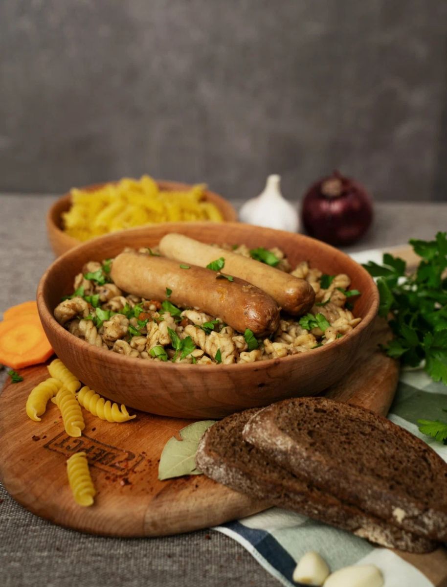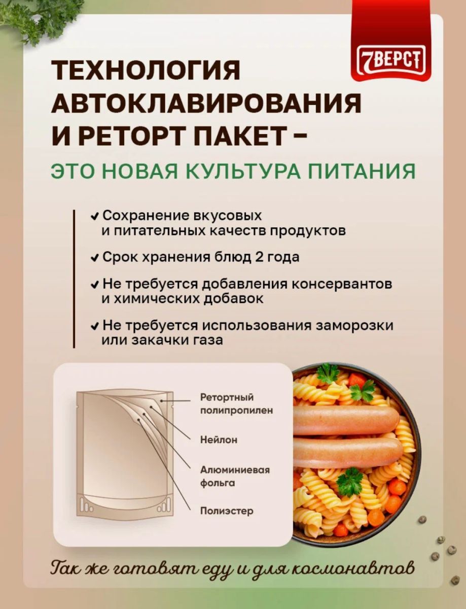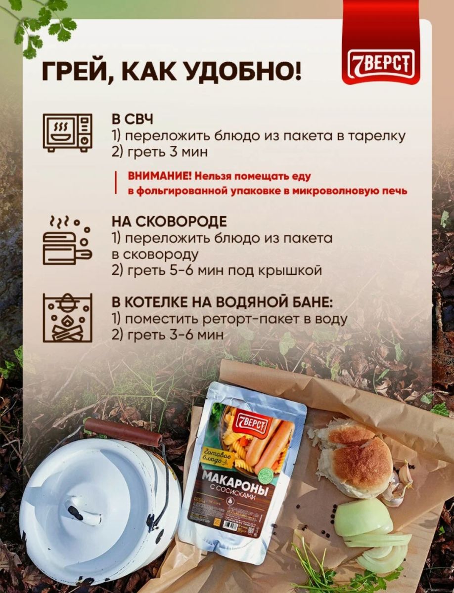 "Макароны с сосисками" - это простое, но очень вкусное блюдо, которое любят и взрослые, и дети. Аппетитные сосиски, обжаренные с луком и морковью, прекрасно сочетаются с нежными макаронами. Легкий соус и ароматные специи делают блюдо еще более аппетитным. Это готовое блюдо в реторт-упаковке - отличное решение для тех, кто ценит свое время и любит вкусно поесть.