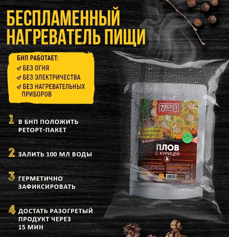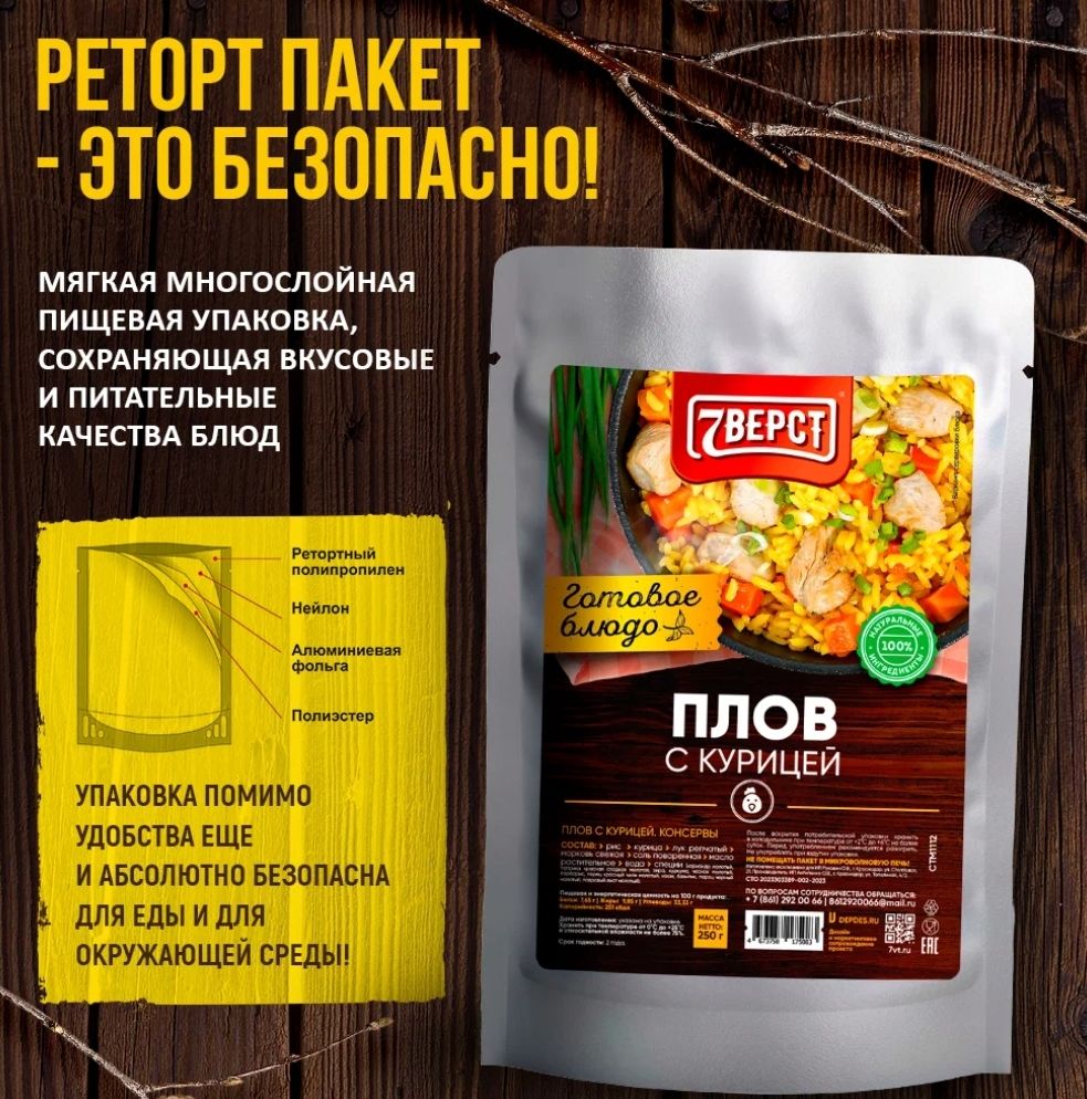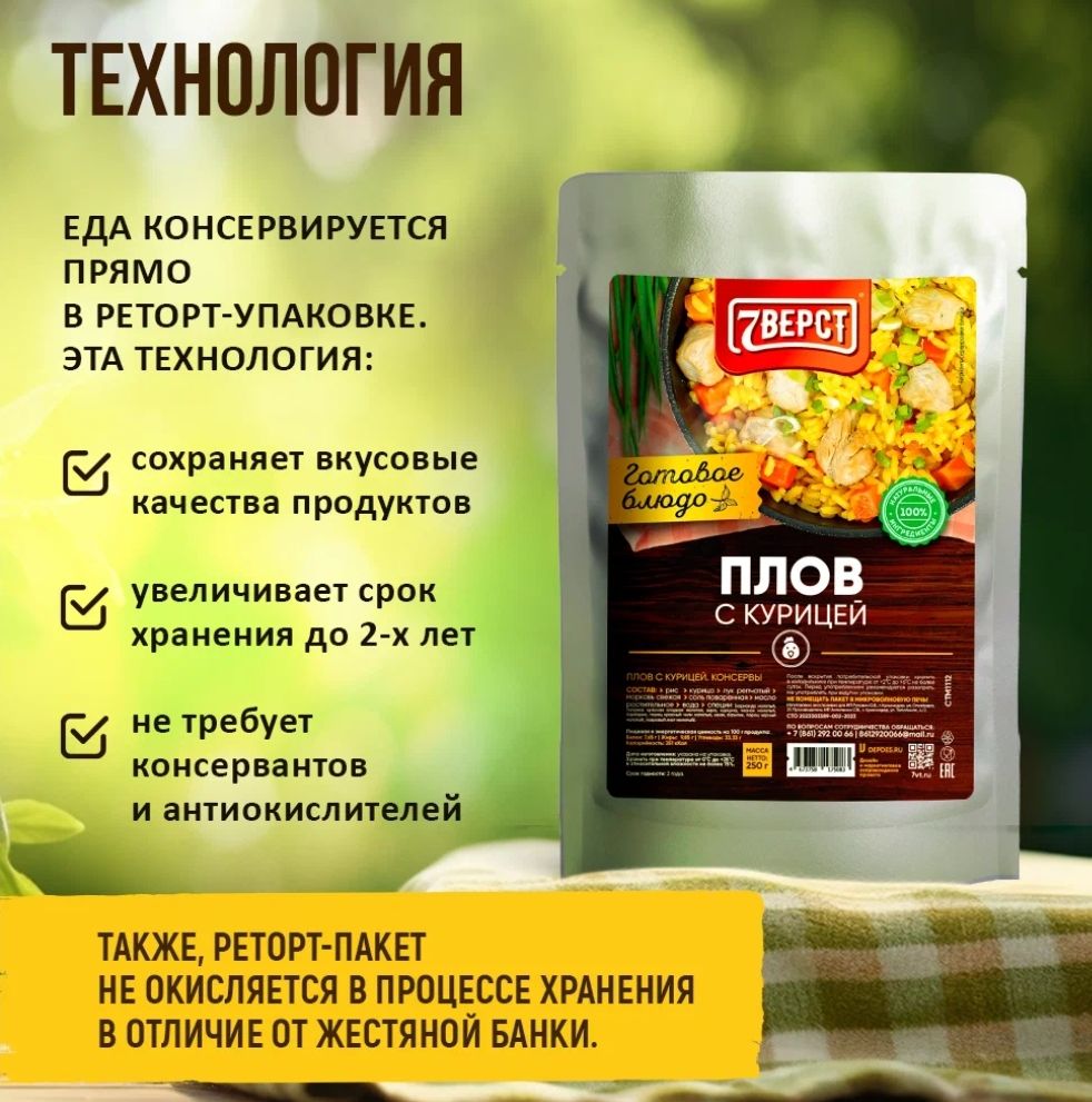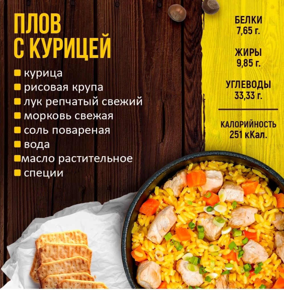 Качественные и питательные блюда помогут вам, если вы не намерены тратить время у плиты или хотите порадовать своих коллег отменным перекусом. Рецепт плова с курицей позволяет производить блюда, по вкусу похожие на домашние. В составе нет вредных добавок, при этом все ингредиенты – только высокого качества. Готовая еда в упаковке защищена от внешней среды: продукции не грозит попадание света или газов. Это существенный плюс для тех, кто употребляет пищу из реторт-пакетов на пикнике. Плов с курицей – диетическая продукция со сбалансированным составом. Вы можете купить готовую еду по выгодной цене и неплохо сэкономить. Это будет особенно заметно, если вы приобретете сразу несколько упаковок. Готовая еда станет для вас оптимальным решением, чтобы устроить быстрый перекус. Вам понадобится 5-10 минут, чтобы довести блюдо до готовности. Для этого выложите плов на тарелку и отправьте ее в микроволновку либо разогрейте на сковороде.