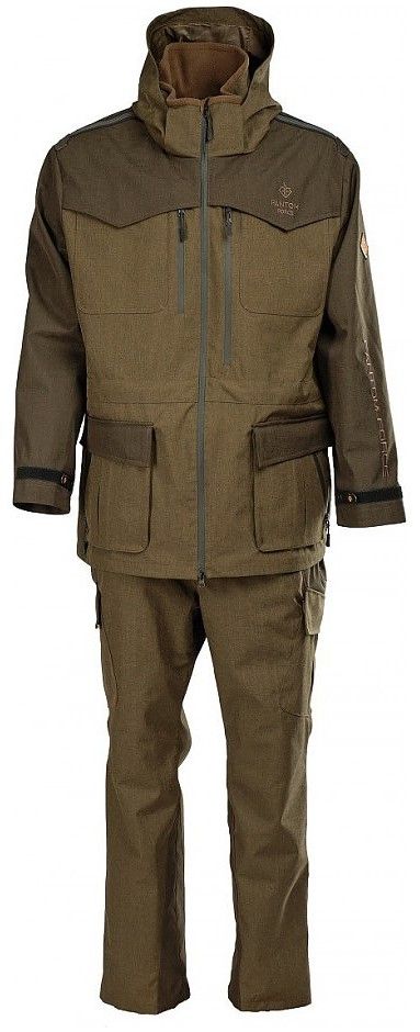 Куртка имеет отстегивающийся капюшон, который можно регулировать по объему и глубине. На плечах куртки есть противоскользящая стропа с кожанным стопером, которая предотвращает сползание рыболовной сумки или ружья. Локтевые зоны куртки имеют эргономичный крой, который обеспечивает свободу движения. Куртка также имеет 14 функциональных карманов. Все молнии на куртке влагозащитные. Фурнитура - магнитная. Внутри куртки есть ветрозащитная юбка, которая не дает продувать спину