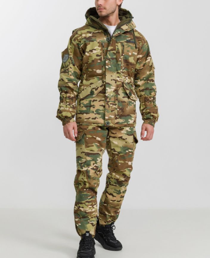 Ткань: р/стоп Наполнитель: Синтепон 250 гр. Вставки cats eуе’s. Куртка подкладка: Флис. Усиления на плечах, локтях. Утяжка сзади капюшона. Утяжки по овалу лица. Молния с обратным реверсом (трактор) + ветрозащитная планка с супатной застежкой на канадской ленте. Резинки на руковах. Манжеты на резинке. Утяжки по низу куртки. Резинка на талии. Липучка для шеврона на левом рукаве