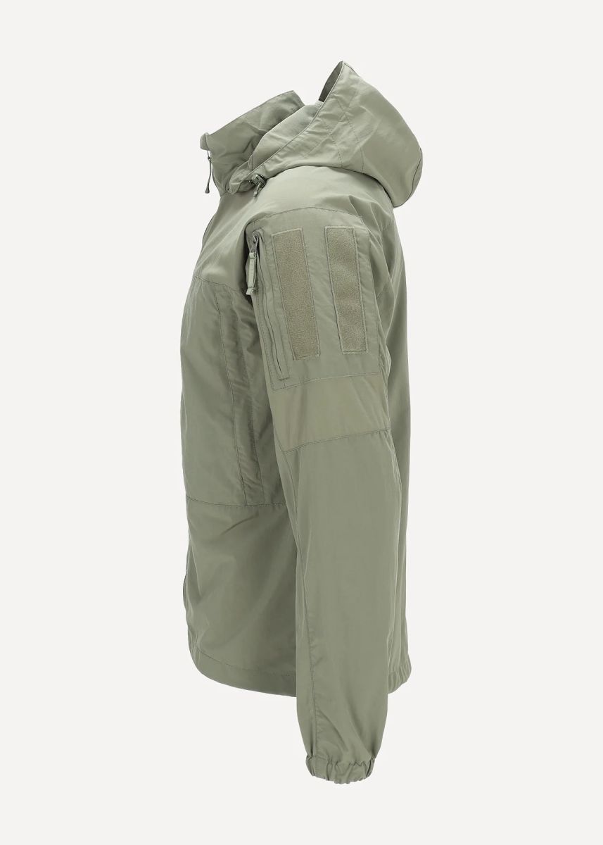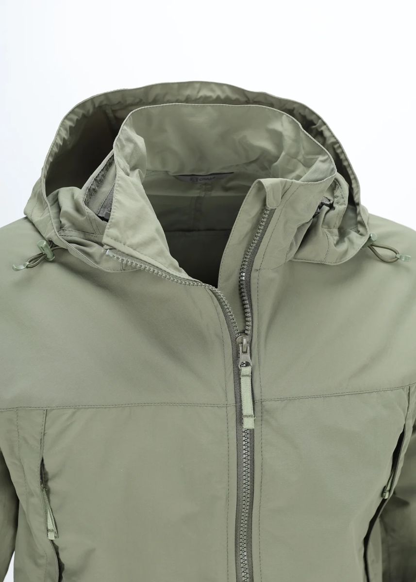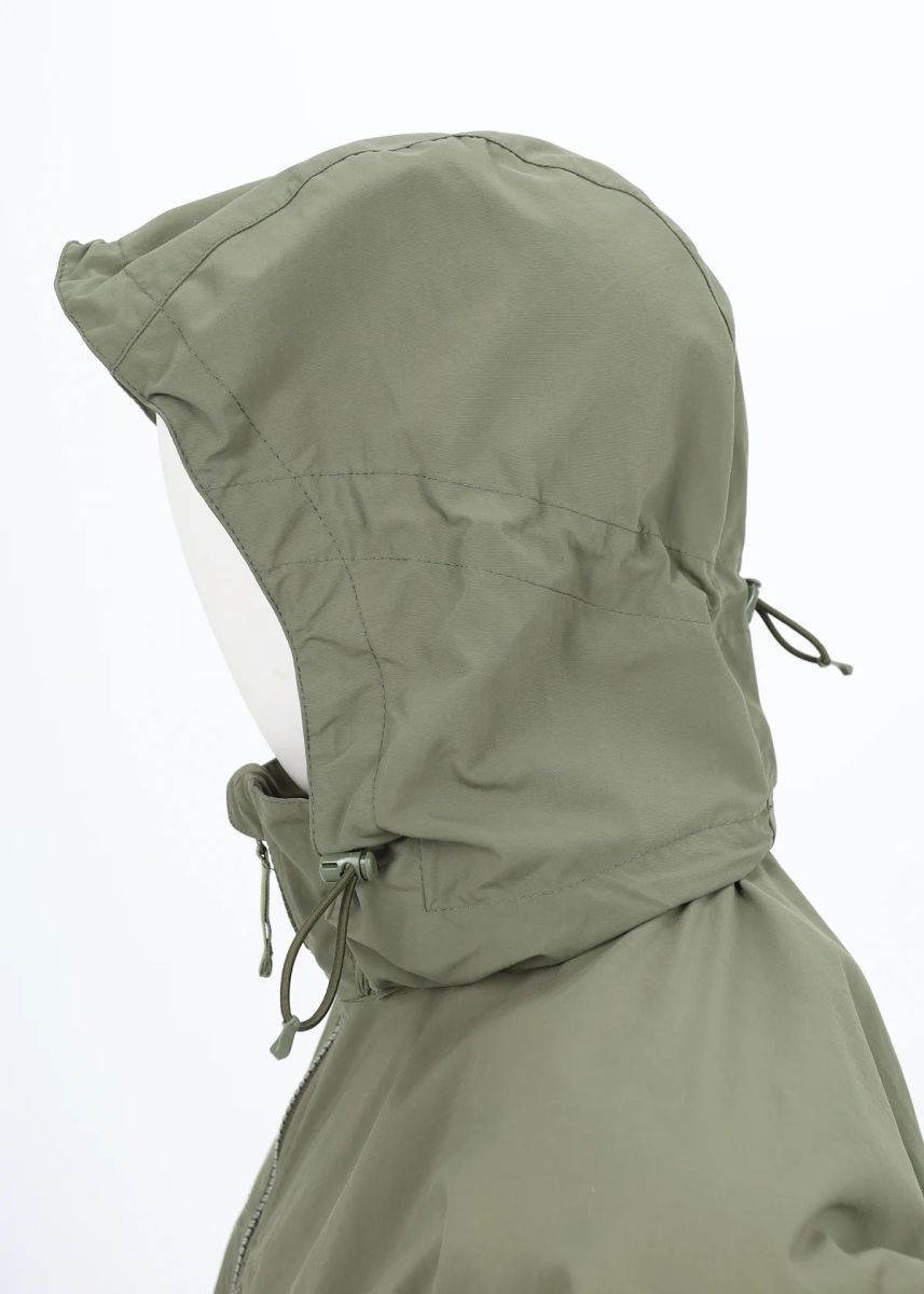 Все внешние молнии — тракторные. Замки оснащены удобными ухватками из тесьмы. Свободный крой, учитывающий возможность использования теплого термобелья и флисовой куртки. Воротник-стойка высотой 9 см. На изнанке в основании воротника вшита вешалка. Капюшон полностью съемный, пристегивается к основанию воротника с помощью скрытой под планкой молнии, а также крепится спереди с помощью двух небольших липучек. Капюшон регулируется в двух измерениях: утяжка вокруг овала лица эластичным шнуром с двумя фиксаторами спереди, и утяжка объема капюшона эластичным шнуром с фиксатором, расположенным на затылке. Центральная молния однозамковая. Изнутри во всю высоту молния прикрыта планкой, сверху перегиб для защиты подбородка