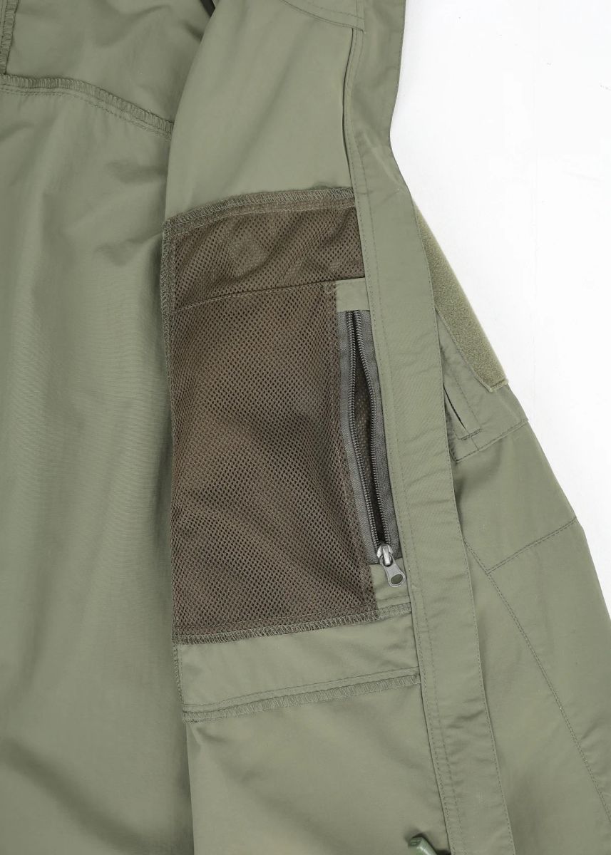 Нагрудные карманы со входом на вертикальной молнии по бокам туловища, молнии защищены планками. Карманы не перекрываются поясами РПС и рюкзаков, вход доступен при надетом бронежилете, разгрузочном жилете или нагруднике. Мешковина из синтетической сетки позволяет использовать карманы для вентиляции.
