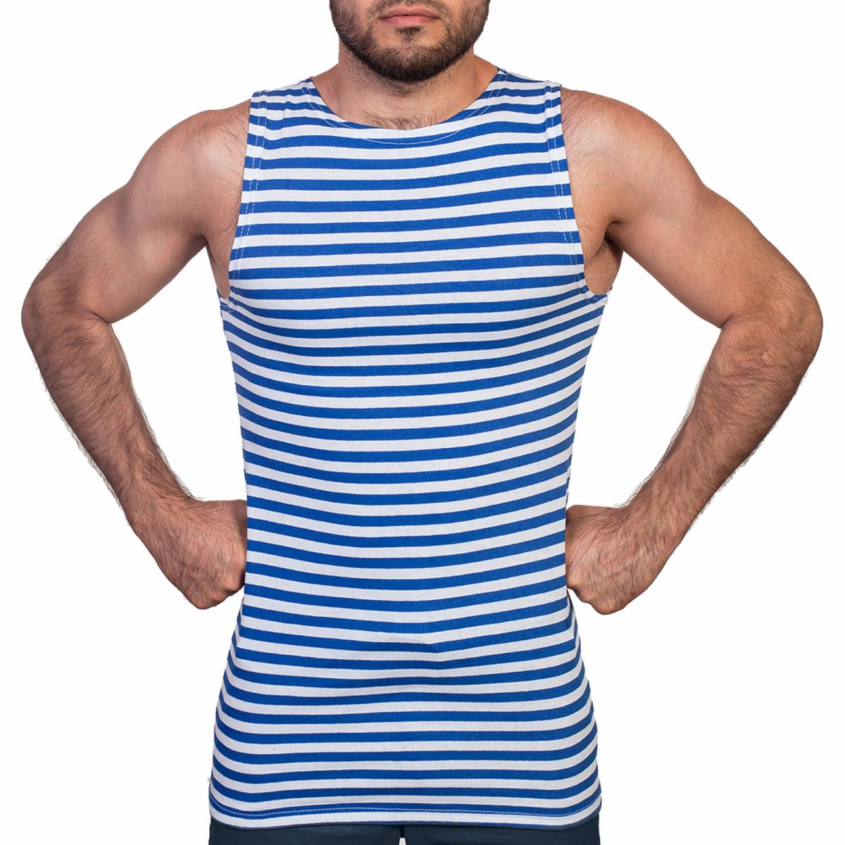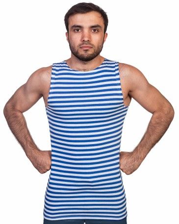 Тельняшка- майка ВДВ с широкими плечами изготовлена из трикотажного полотна кулирная гладь, связана из нитей двух цветов и имеет одинаковый цвет как снаружи, так и внутри. Состоит из хлопка на 100%, имеет отечественный Гигиенический Сертификат и полностью соответствует ГОСТу МО РФ.