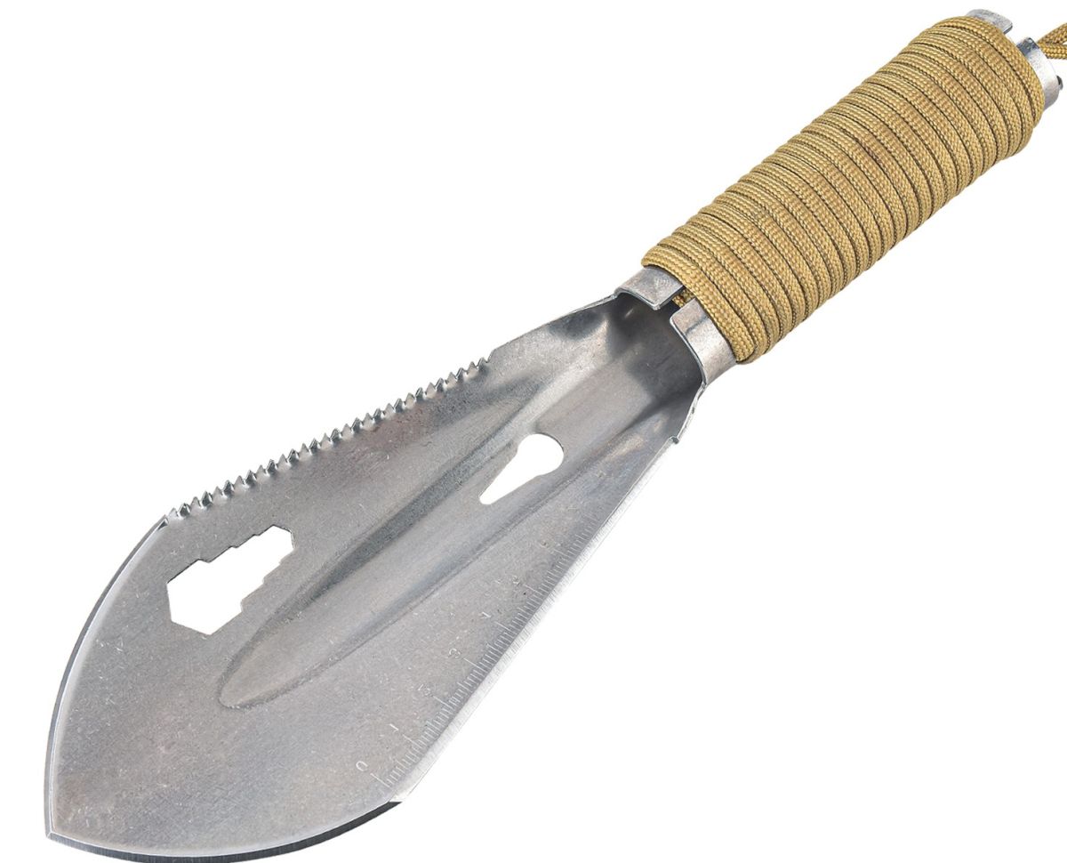 удобный компактный инструмент, сочетающий в себе множество функций: лопатка, совок, нож, гвоздодер, ножовка, гаечный ключ четырех размеров, паракордовый шнур 250 см. Отличный инструмент для туристов, выживальщиков, рыбаков и охотников, садоводов и огородников!