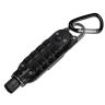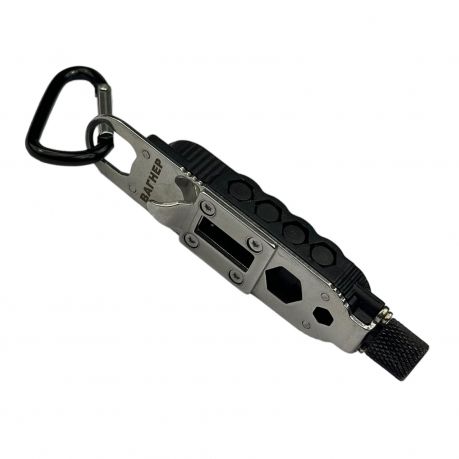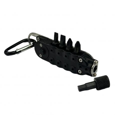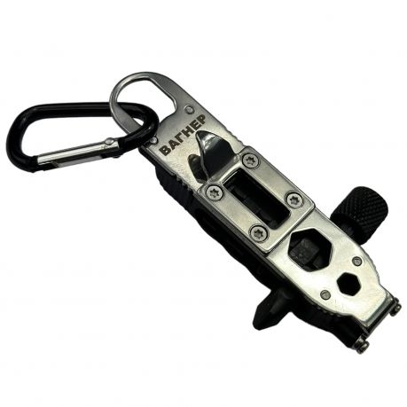 Компактный инструмент пригодится для решения повседневных задач вместо использования громоздкого инструмента. Удобный подвес на карабин, встроенный фонарик, открывалка и набор бит. В комплекте 2 плоские и 2 крестовые биты. На тыльной стороне расположены две шестигранные отвертки. Также может использоваться в качестве аврийного стеклобоя.