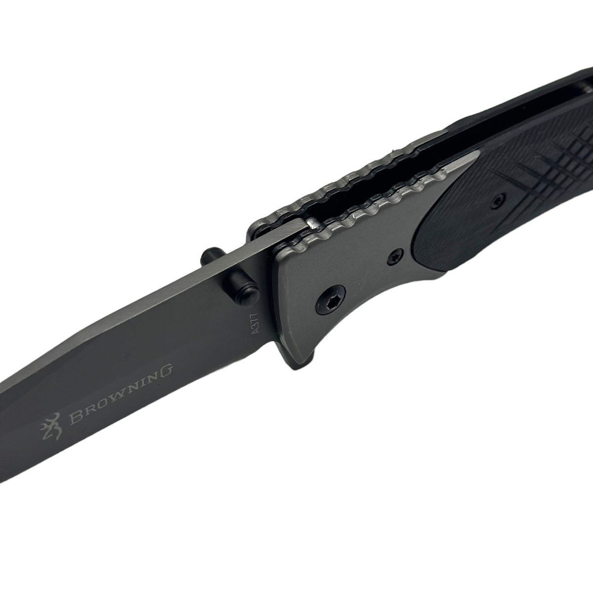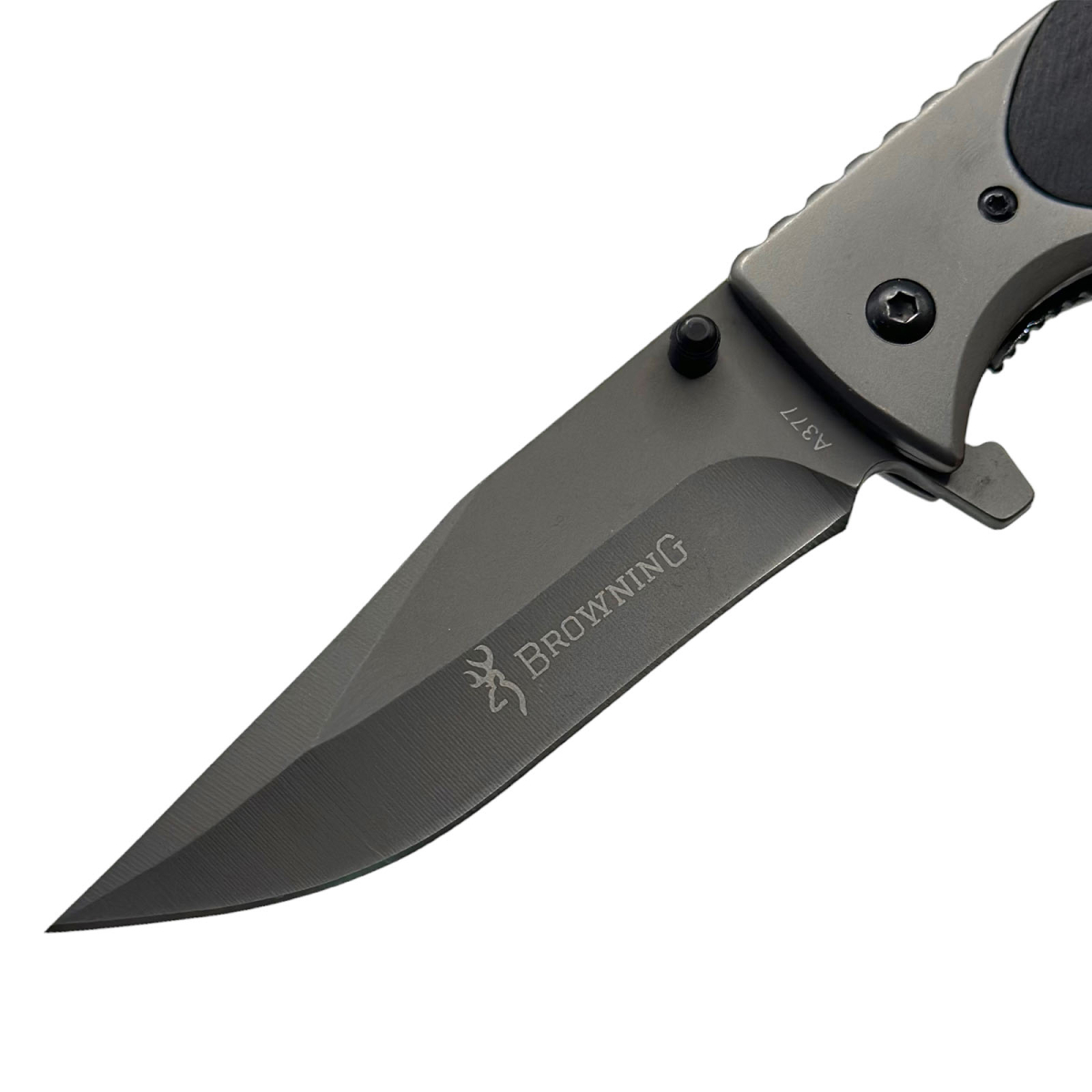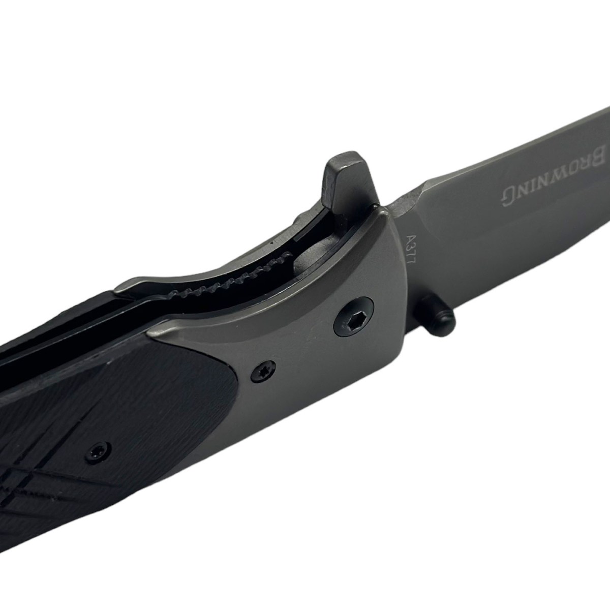 Складной полуавтоматический нож Browning A377 Tactical Folding (США). Нож Browning A377 произведен из качественной стали 440С. Рукоятка ножа изготовлена из металла с накладками. На рукоятке есть крепление-клипса, которое позволяет носить нож цепляя его за край одежды или сумки. На тыльной части рукоятки расположено отверстие для установки темляка. Для открытия ножа используют шпеньки, которые предназначены для открытия одной рукой. Нож оснащен замком типа Liner-Lock.