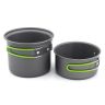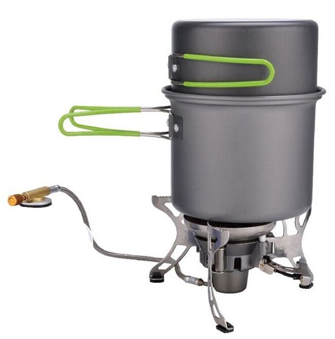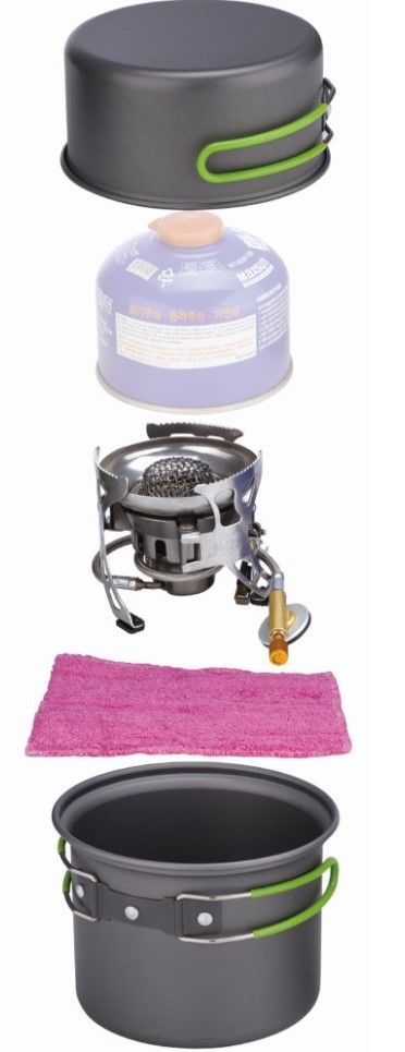 Посуда с антипригарным покрытием и складывающимися ручками, покрытыми силиконовым материалом, обеспечивает защиту от ожогов. Общий вес системы составляет всего 580 грамм, что делает ее легкой и компактной для переноски.
