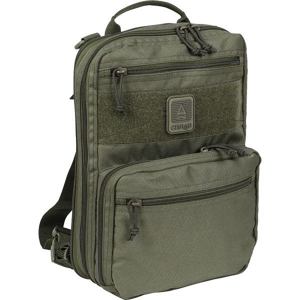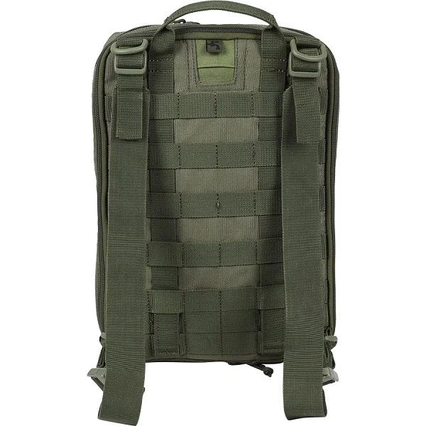 В качестве вертикально ориентированной сумки через плечо. В комплекте съемная плечевая лямка из широкой стропы, крепящаяся карабинами-крючками к пластиковым полукольцам, нашитым в области верхних углов спинки