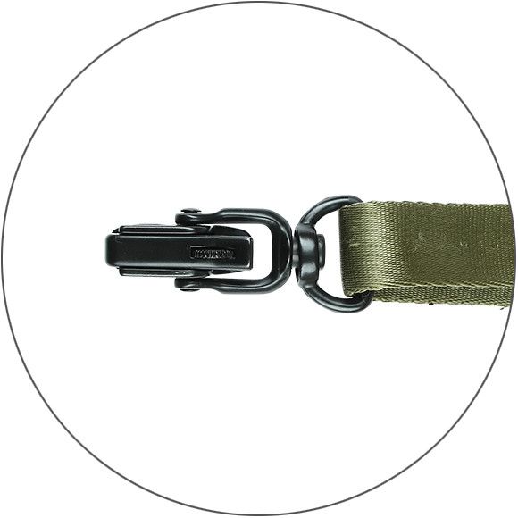 Ремень оснащен двухточечной системой крепления, что позволяет использовать его как в двухточечном, так и в одноточечном варианте. Это обеспечивает большую гибкость при использовании и позволяет адаптировать ремень под различные условия и предпочтения пользователя.