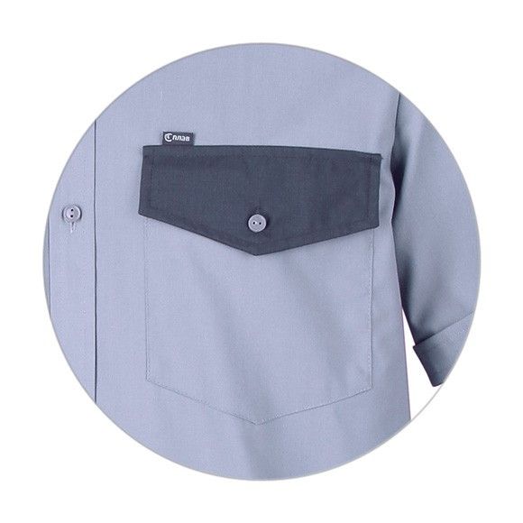 Дизайн рубашки продуман до мелочей: воротник-стойка добавляет строгости образу, а аккуратные пуговицы на передней части создают профессиональный вид. Карманы на груди имеют дополнительное усиление по краям,