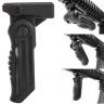 Передняя тактическая складная рукоятка с креплением на планку Вивера. Применяется для улучшения контроля оружием при стрельбе. Благодаря компактным размерам рекомендуется для пистолетов-пулеметов, компактных автоматов и карабинов. Наличие дополнительной вертикальной рукояти создает две жесткие точки удержания оружия. Соответственно хват стрелка становится более твердым, что снижает воздействие отдачи на кучность огня, особенно при стрельбе очередями. При этом присутствует 3 статичных положения фиксации — вертикальное, горизонтальное и под 45 градусов. Следовательно, устройство применимо в рамках концепции треугольных рукоятей и стандартного удержания. Для смены положения отжимается кнопка, после чего выбирается требуемый угол.