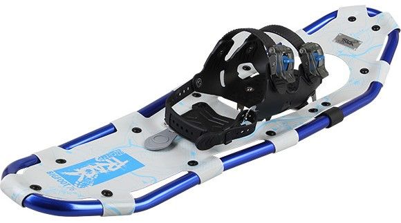 Платформа снегоступов имеет прочный каркас, который равномерно распределяет вес тела, снижая утомляемость при ходьбе. Синий цвет платформы с белыми элементами делает дизайн стильным и заметным на фоне снега. Ремешки для крепления к ботинкам удобны и надежны, обеспечивая комфортное ношение.