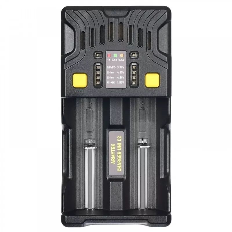 Armytek Uni C2 – универсальное зарядное устройство с поддержкой IMR, Li-Ion 4.2V, Li-Ion 4.35V, Ni-MH, Ni-Cd и Li-FePO4 аккумуляторов. С помощью него Вы можете заряжать одновременно аккумуляторы разных типов, благодаря тому, что напряжение подается отдельно на каждый канал. С помощью одной кнопки Вы легко сможете выбрать тип батареи и ток заряда. Устройство автоматически запоминает последний использованный тип аккумулятора, что очень удобно для быстрого запуска при следующем включении и в случае отключения электричества. Зарядное устройство изготовлено из огнестойких материалов и предназначено для прекрасного теплоотвода. Автомобильный адаптер в комплекте для быстрой зарядки в автомобиле.